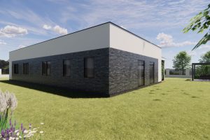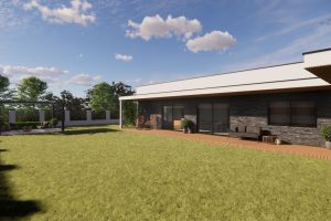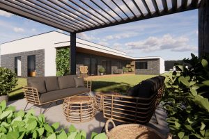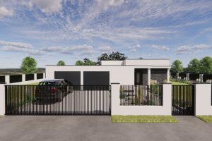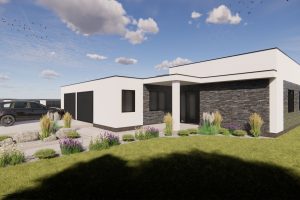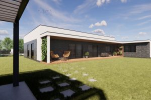 PAKUBA je jednopodlažní dům v obdélném půdorysném tvaru zastřešený plochou střechou, který je doplněn o garáž a zastřešenou terasu s výhledem do zahrady.